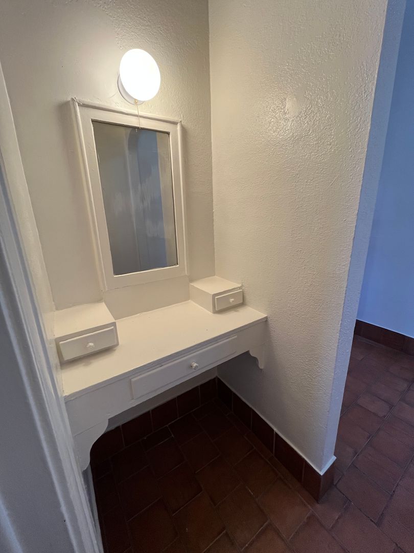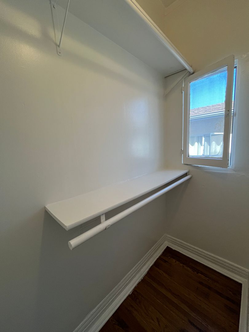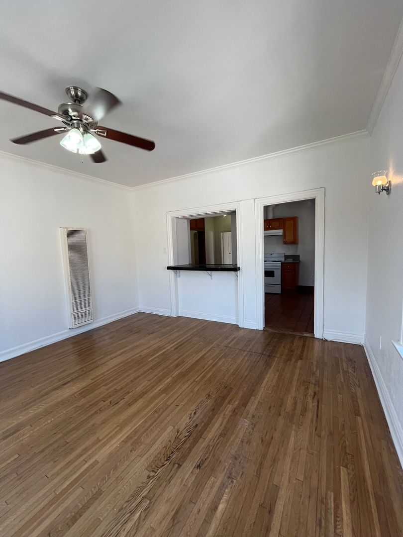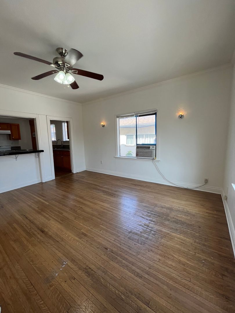 This corner unit has hardwood flooring, spacious kitchen with plenty of cabinets, and all white appliances. The unit comes with a wall mounted AC and ceiling fan. Bathroom has a tiled shower.