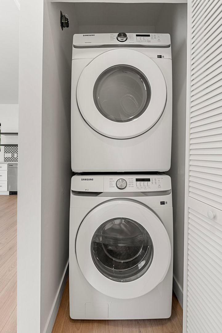 The double high ceilings and large windows create an airy, light-filled space that is both inviting and comfortable. The modern kitchen, equipped with stainless steel appliances, is a chef's dream, while the beautiful faux wood vinyl plank flooring adds a touch of elegance to the entire space. The apartment also features HVAC, recessed lighting throughout, and large walk-in closets, providing ample storage space. The in-unit laundry adds to the convenience, making this apartment a perfect blend of luxury and practicality. The private front balcony is the cherry on top, offering a serene spot to relax and unwind.