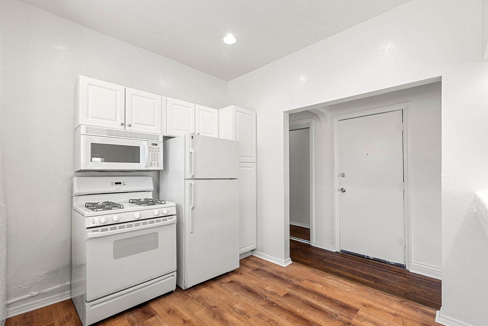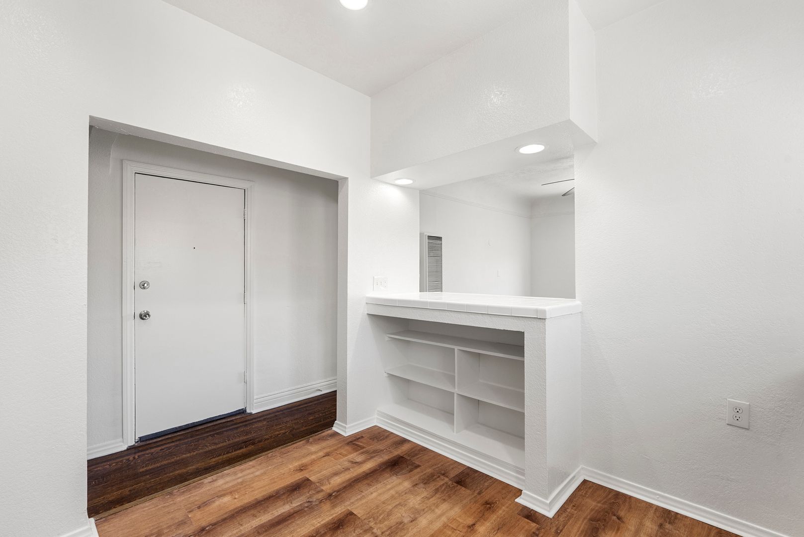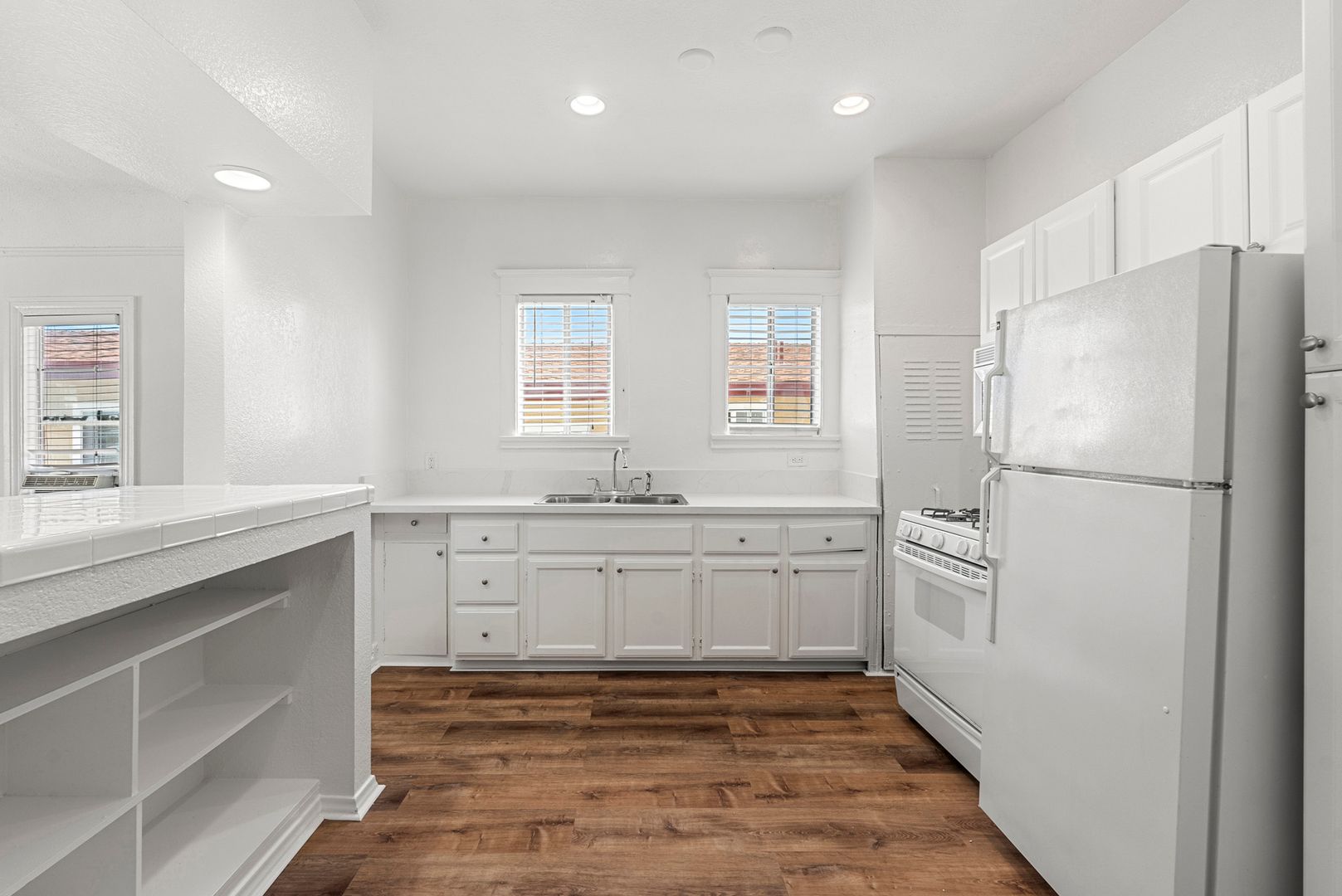 This corner unit has hardwood flooring, spacious kitchen with new flooring, white cabinets, never been used counter tops, and all white appliances. The unit come with a wall mounted AC and heater, and ceiling fan. Bathroom has a tiled shower, a new vanity and new flooring.