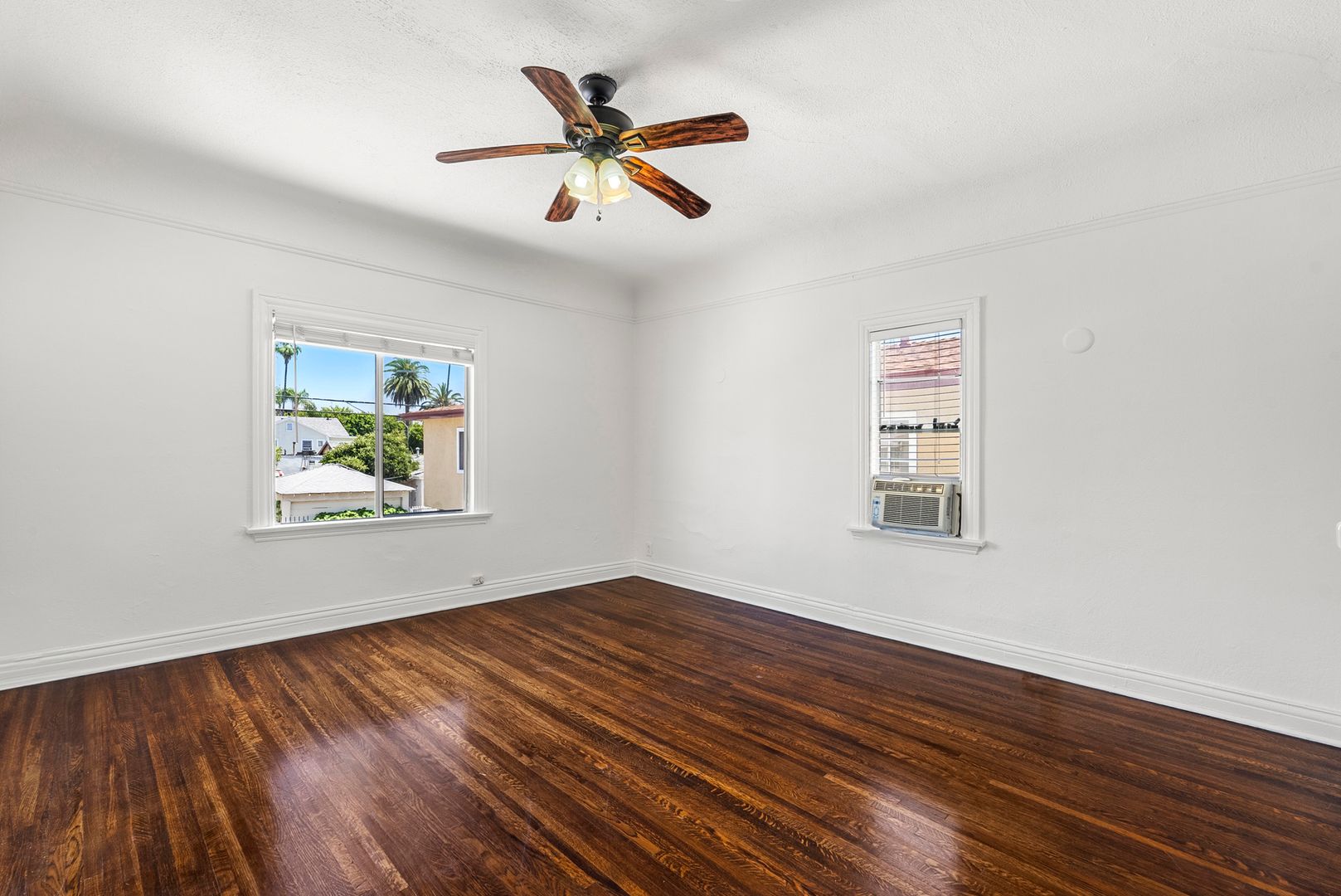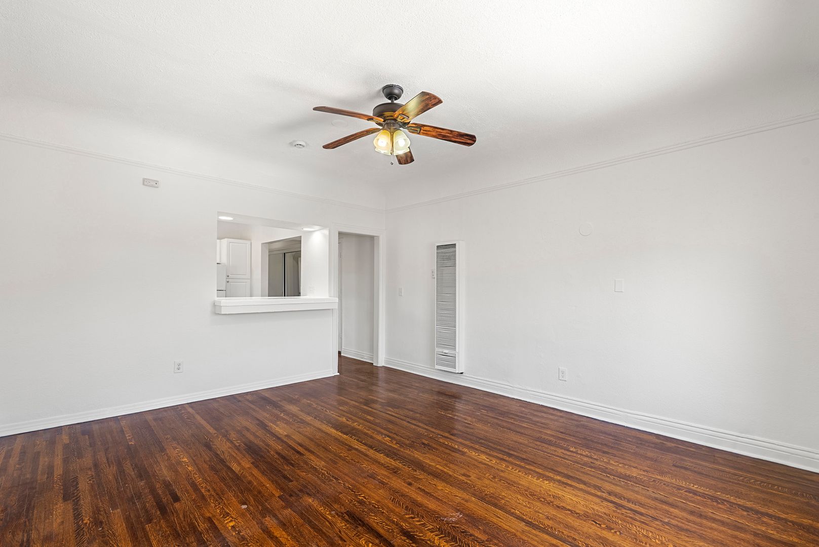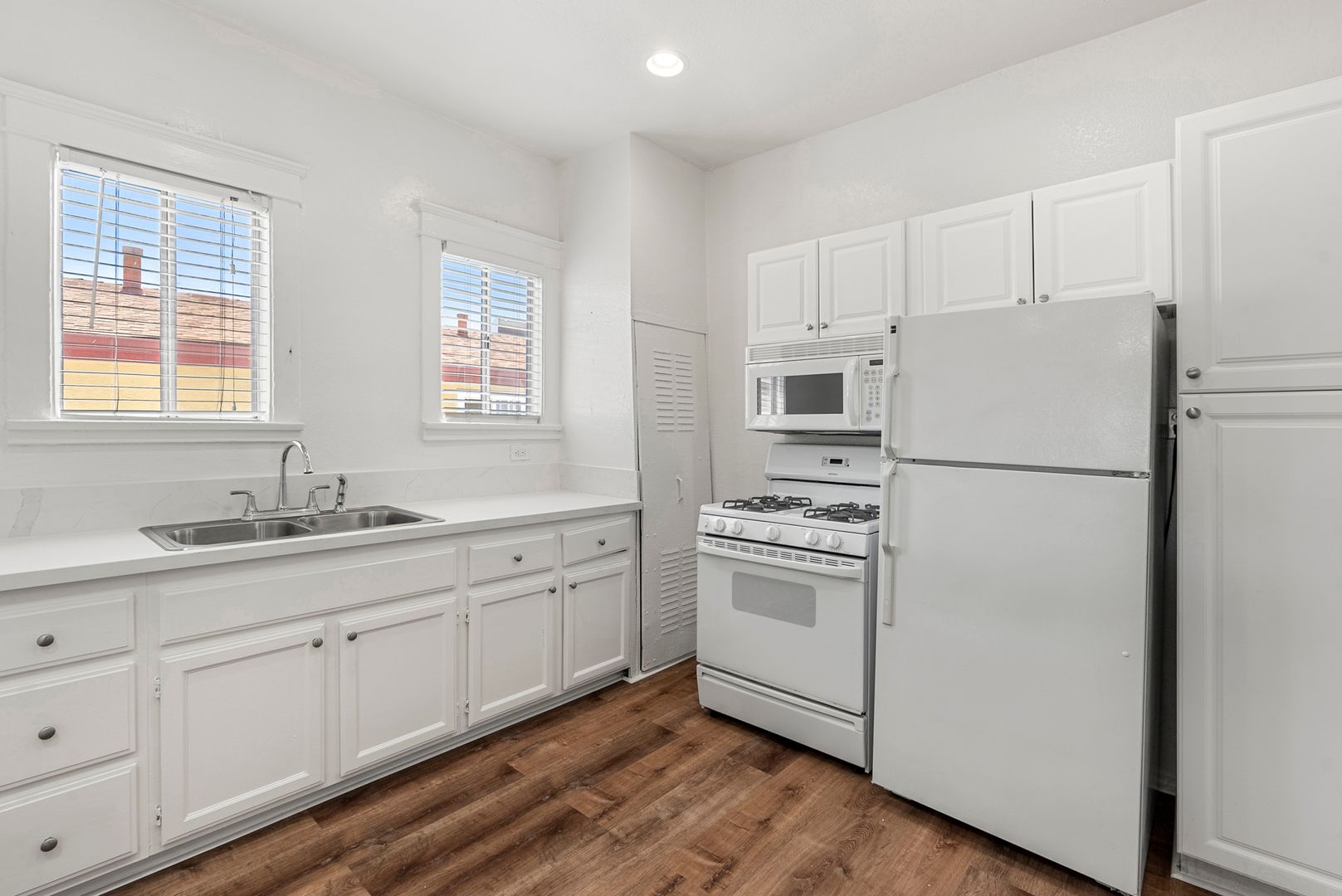 This corner unit has hardwood flooring, spacious kitchen with new flooring, white cabinets, never been used counter tops, and all white appliances. The unit come with a wall mounted AC and heater, and ceiling fan. Bathroom has a tiled shower, a new vanity and new flooring.