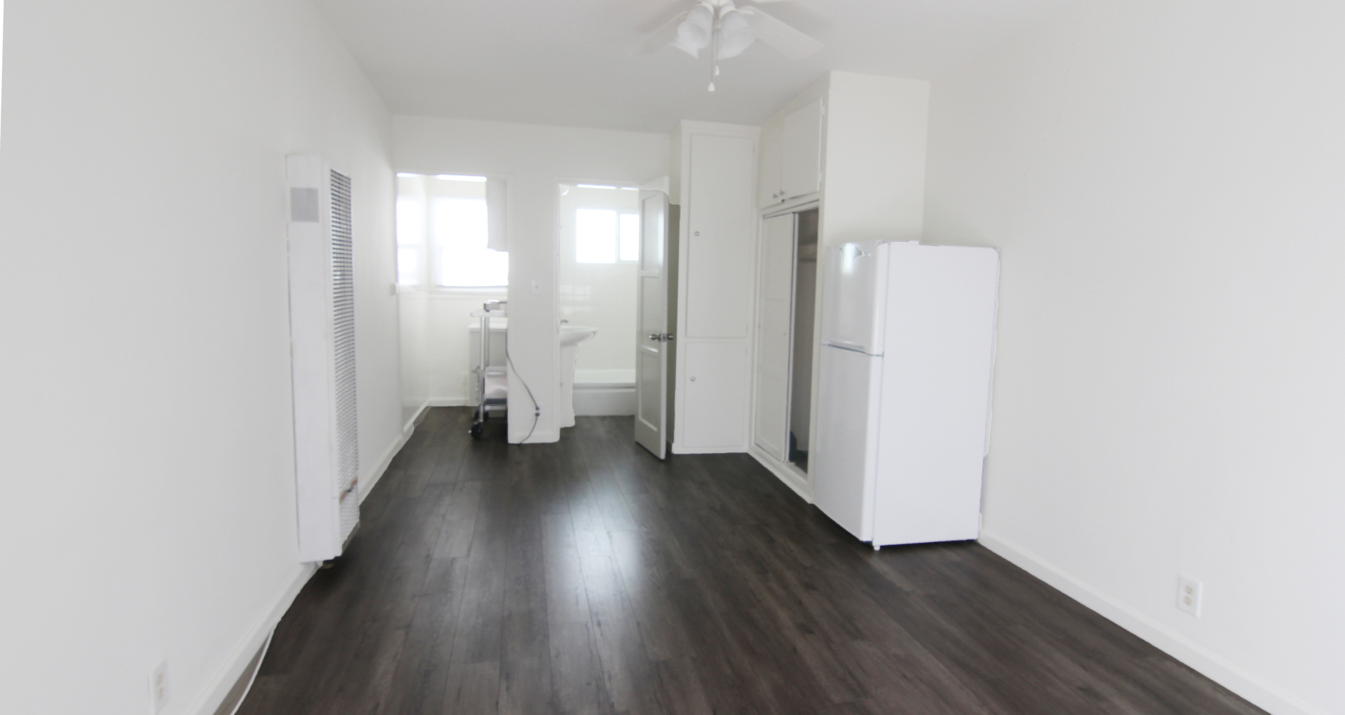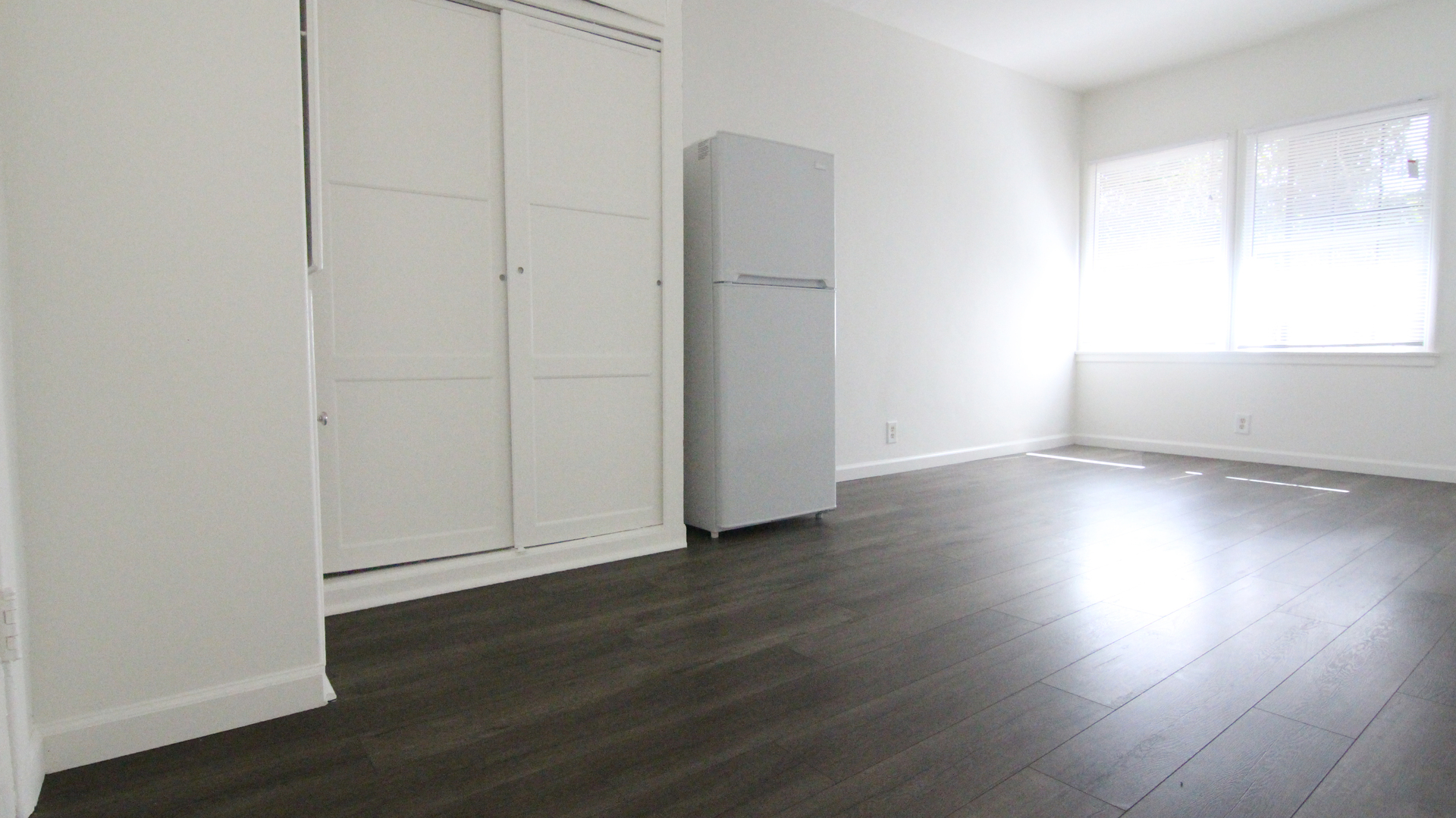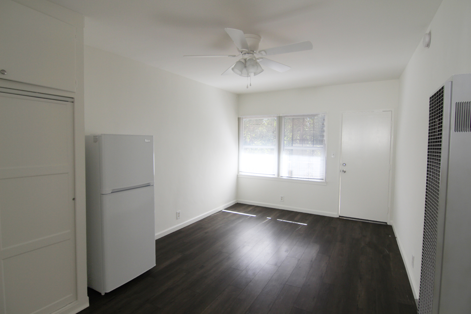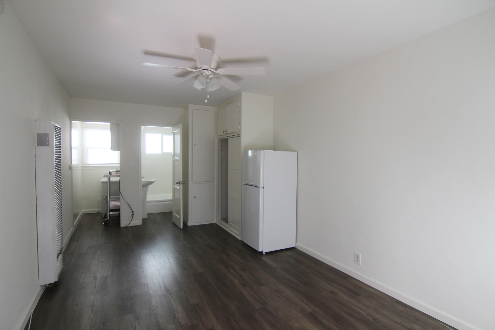 This unit has been recently updated with fresh paint, brand new faux-wood laminate flooring and new window treatments throughout. Included is a refrigerator and sink in a super-efficient half-kitchen. The kitchen area includes a hot plate. Additionally, the unit is furnished with a ceiling fan, new light fixtures and lots of built in storage space.