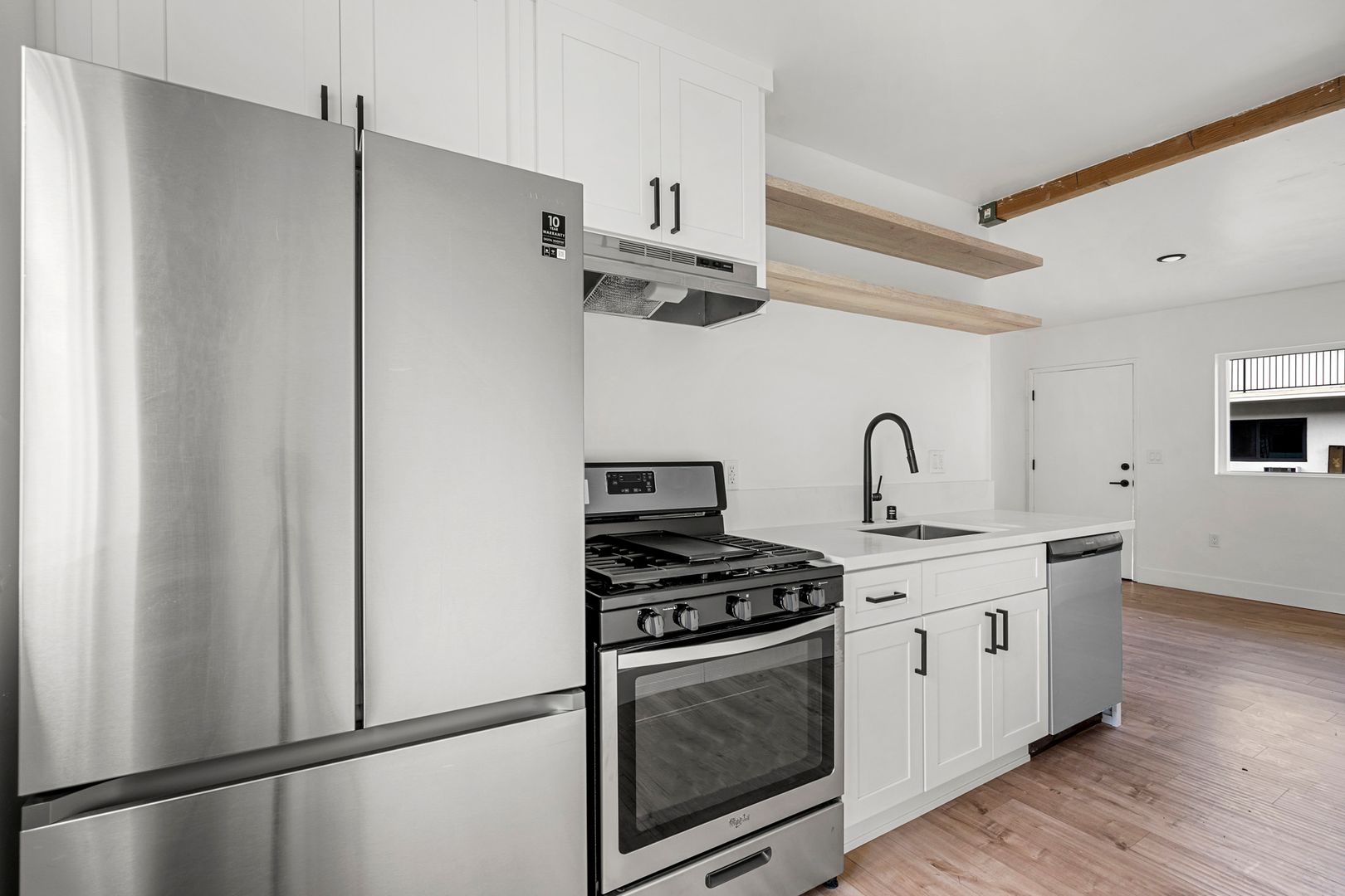 - Open wood shelving in the kitchen